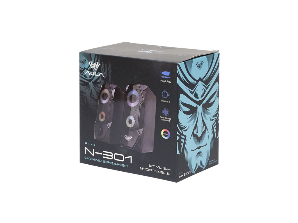 Aula N-301 jsou kompaktní a stylové USB reproduktory s RGB podsvícením, které dodávají moderní vzhled pro váš pracovní nebo herní stůl. Díky jednoduchému napájení přes USB jsou tyto reproduktory snadno použitelné a poskytují kvalitní zvukový výkon.