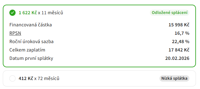 - Vyberte možnost splátek – zvolte odklad splátky při čerpání po dobu 11 měsíců