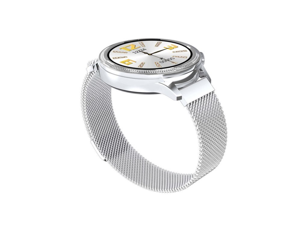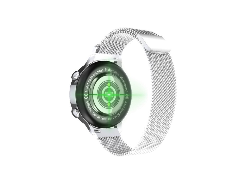 Moderní, luxusní fitness hodinky Carneo Gear+ deluxe v elegantním stříbrném provedení disponují IPS barevným displejem, který lze aktivovat pouhým otočením ruky. Umožňují měření srdečního tepu, krevního tlaku, okysličení krve, ujeté vzdálenosti, monitorování spálených kalorií či kvality spánku. Jejich součástí je baterie s výdrží cca 3-4 dny. Podle certifikace IP67 jsou odolné vůči vodě a prachu. Hodinky s podporou technologie Bluetooth 5.0 jsou kompatibilní s operačním systémem iOS a Android. Kovový, pletený řemínek s magnetickým úchytem je příjemný na dotek a zaručuje komfort po celý den.