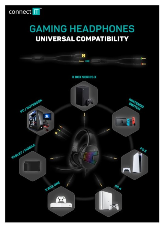 - Kompatibilita: PC/notebooky, Playstation, Xbox, Nintendo Switch, mobilní telefony, tablety