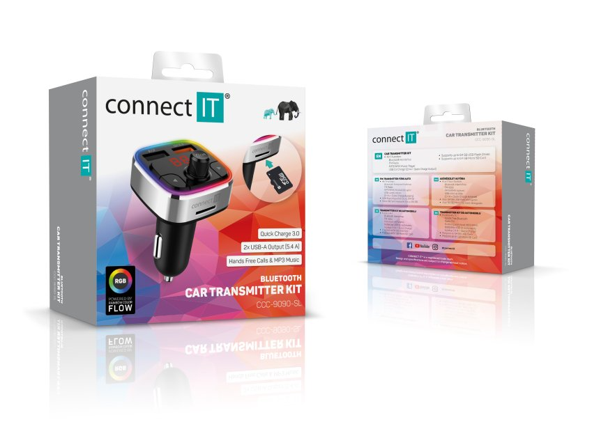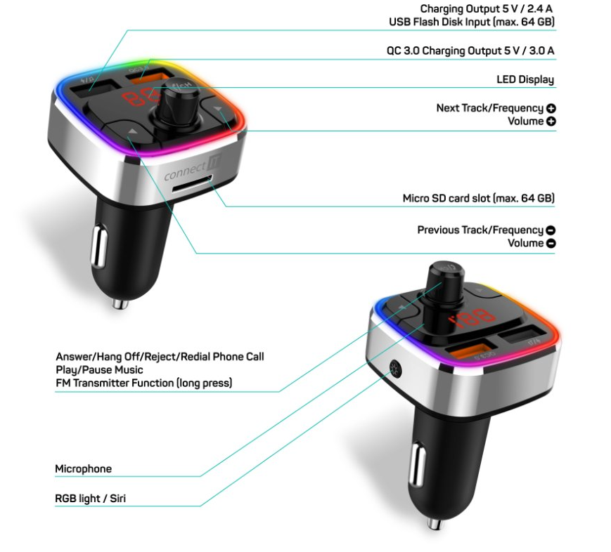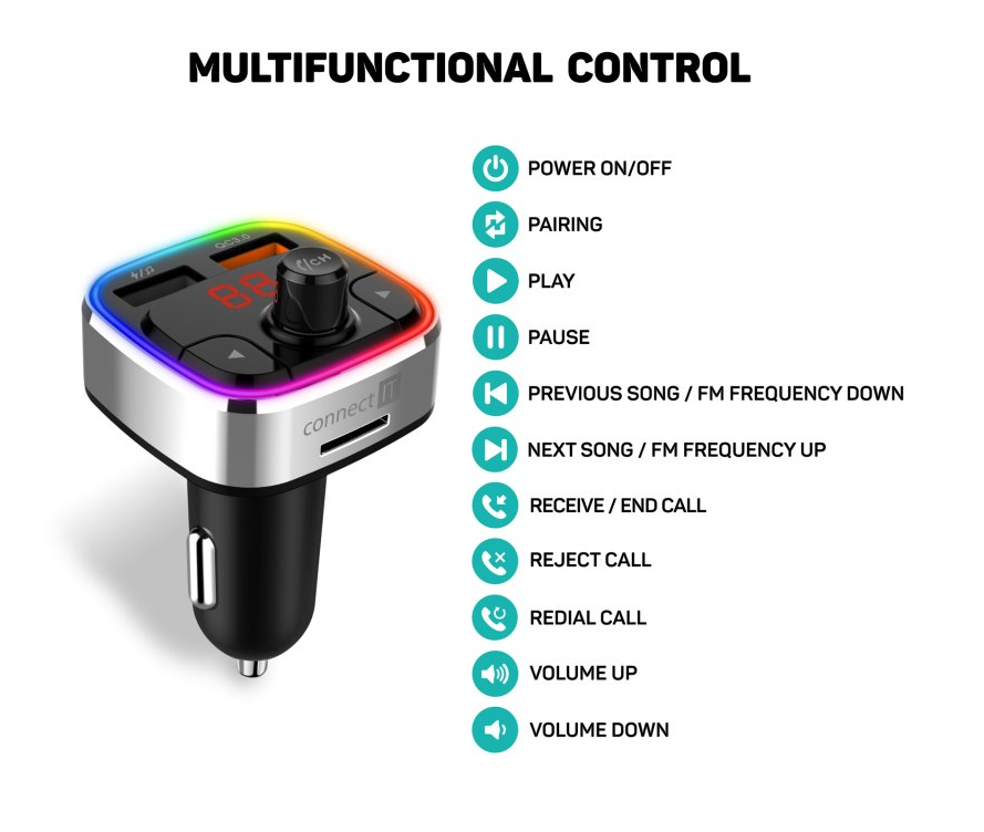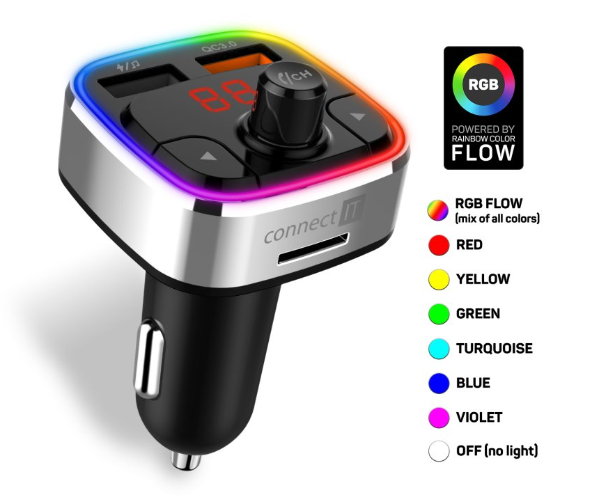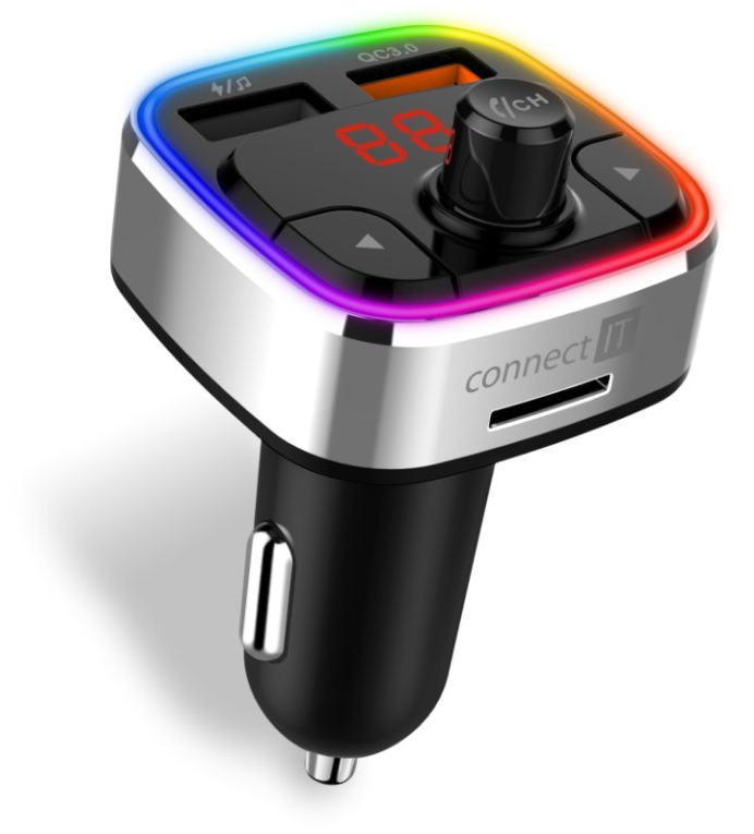 Multifunkční zařízení do automobilu kombinující Bluetooth transmitter, handsfree a rychlou autonabíječku. Connect IT CarRGB je praktický FM transmitter určený pro použití v zásuvce automobilového zapalovače. Umožňuje bezdrátové přehrávání hudby z mobilního telefonu, handsfree telefonování i nabíjení mobilních zařízení během jízdy.