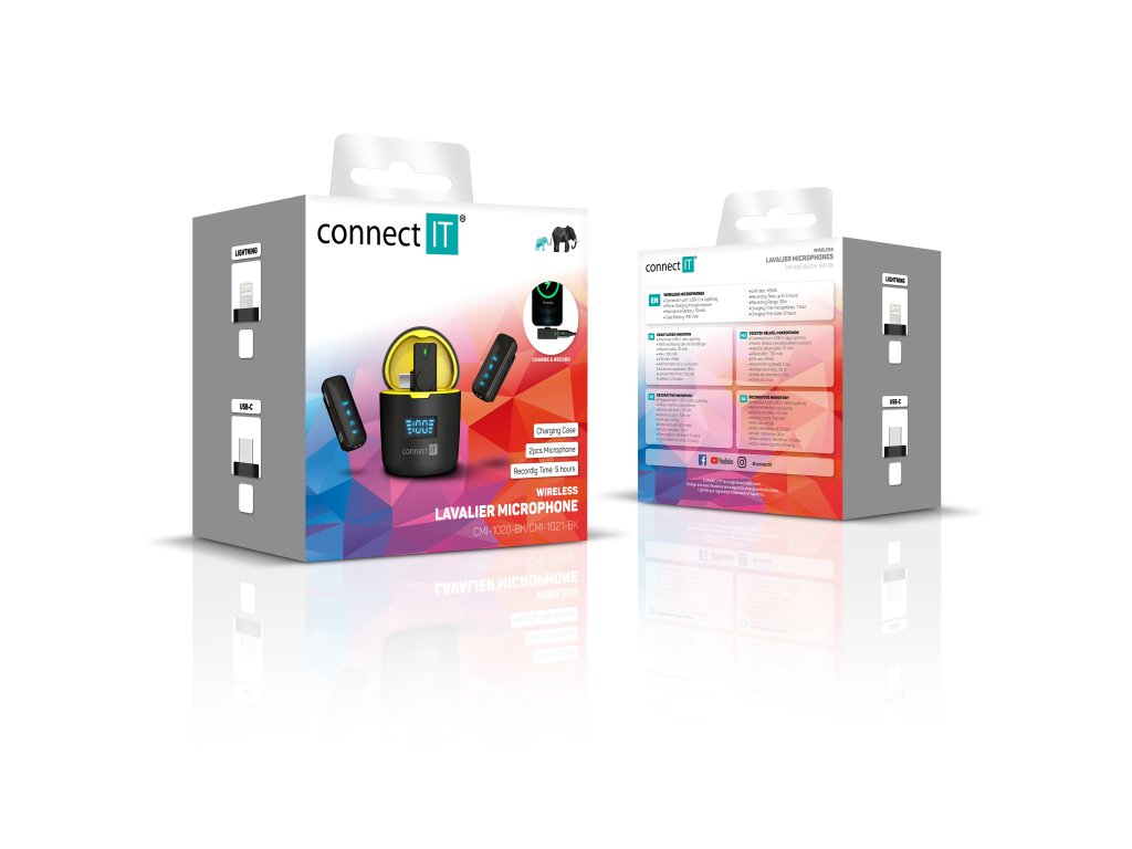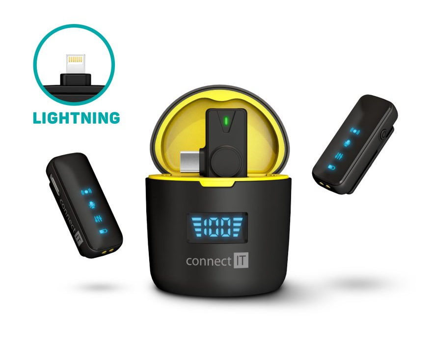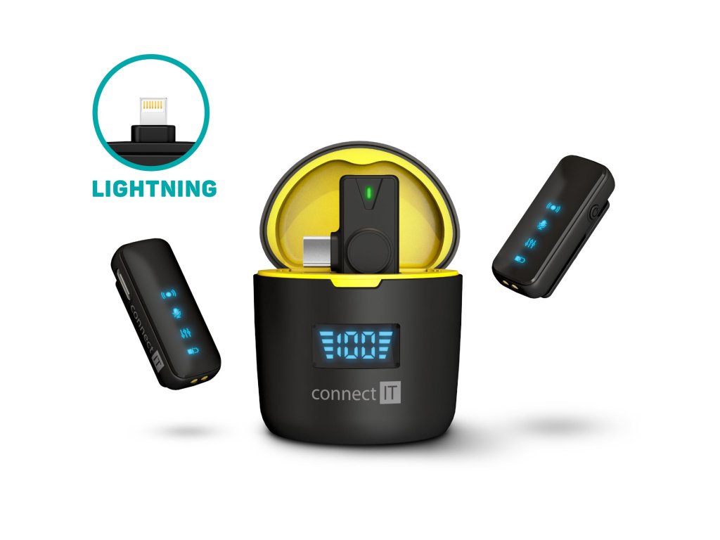 Praktický bezdrátový mikrofonní set pro mobilní tvůrce obsahu. Connect IT ClipMic Pro je sada dvou kompaktních lavalier mikrofonů s bezdrátovým přijímačem, která umožňuje jednoduché a kvalitní nahrávání zvuku při tvorbě videí, rozhovorů, podcastů nebo online obsahu. Díky připojení přes Lightning konektor je ideální zejména pro iPhone nebo iPad.
