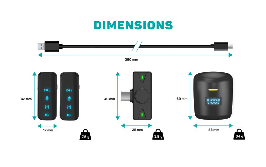 Mikrofony jsou navrženy tak, aby byly malé, lehké a snadno přenosné. Každý mikrofon váží pouze 7,5 g, takže při použití téměř nepřekáží a lze jej pohodlně připnout na oblečení. Přijímač se jednoduše připojí do Lightning portu mobilního zařízení a celý systém je připraven k použití bez složitého nastavování.