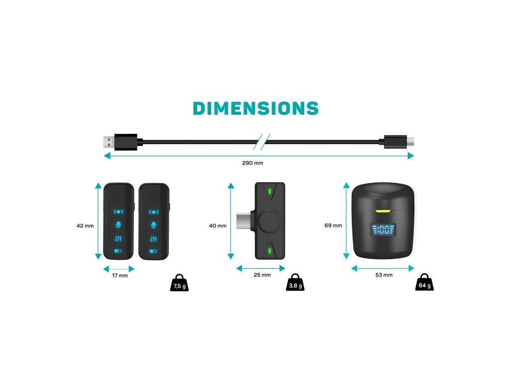 Mikrofony jsou navrženy tak, aby byly malé, lehké a snadno přenosné. Každý mikrofon váží pouze 7,5 g, takže při použití téměř nepřekáží a lze jej pohodlně připnout na oblečení. Přijímač se jednoduše připojí do USB-C portu mobilního zařízení a celý systém je připraven k použití bez složitého nastavování.