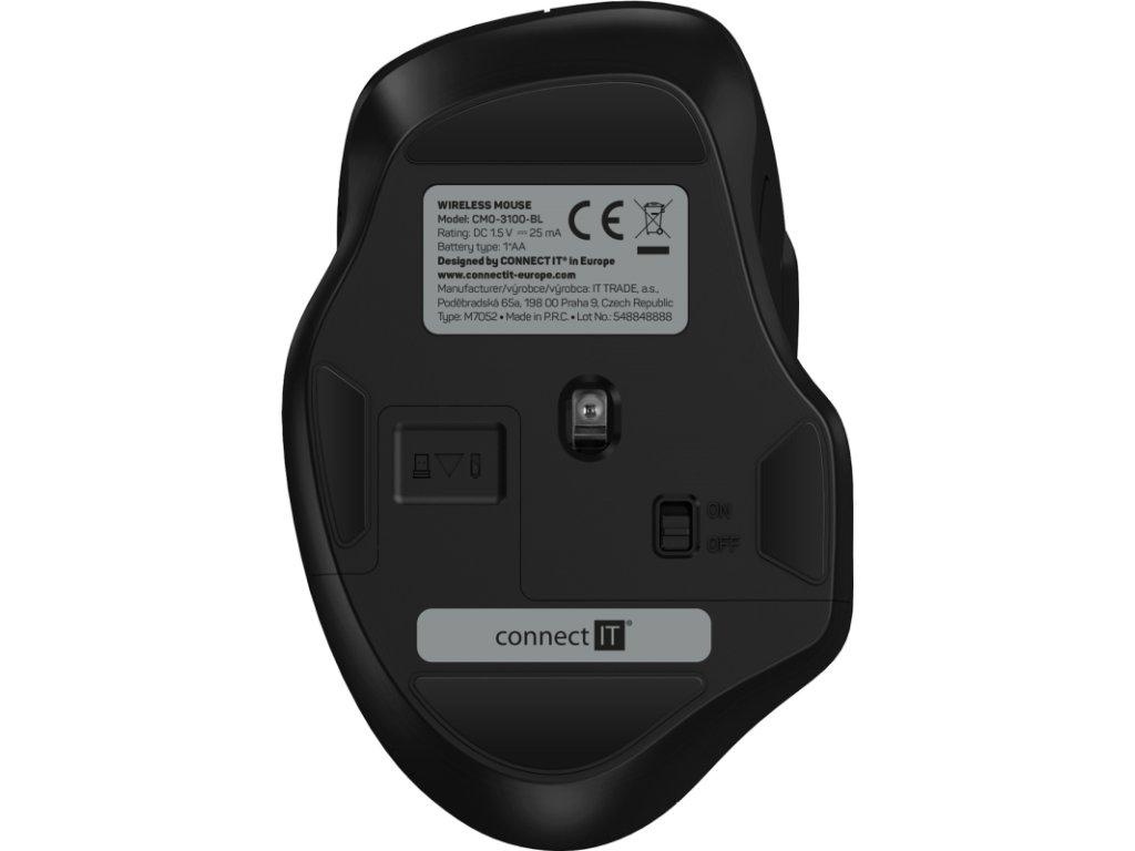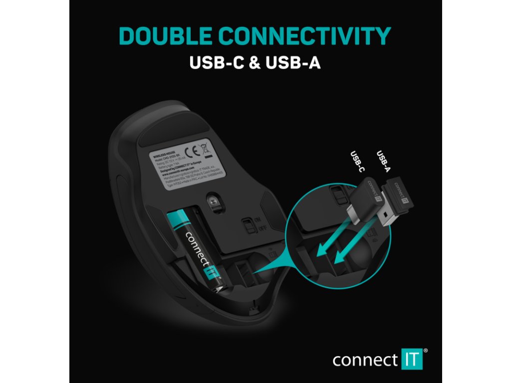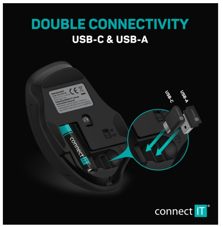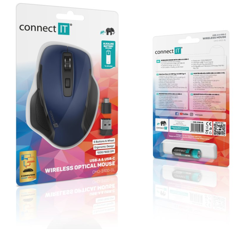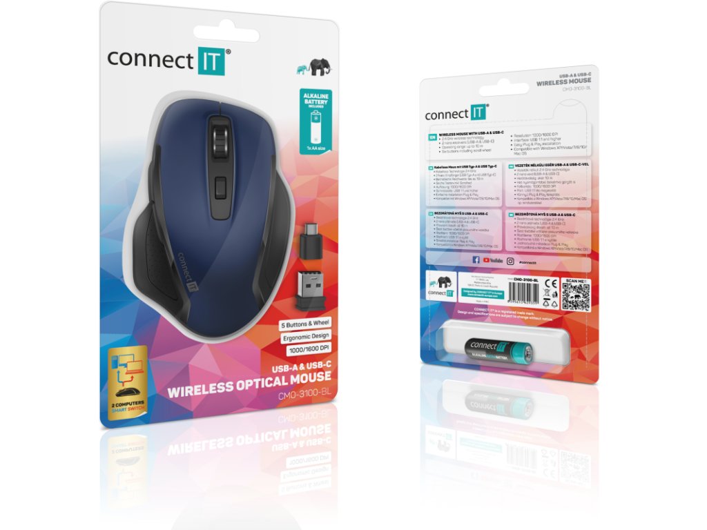 - Obsah balení: myš, USB-A nano přijímač, USB-C nano přijímač, alkalická baterie CONNECT IT, návod k obsluze