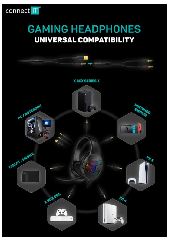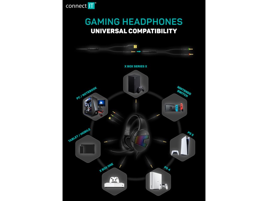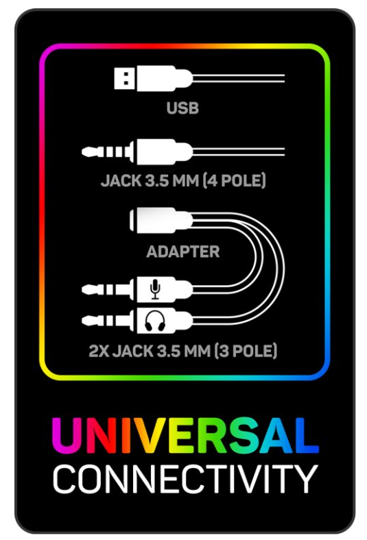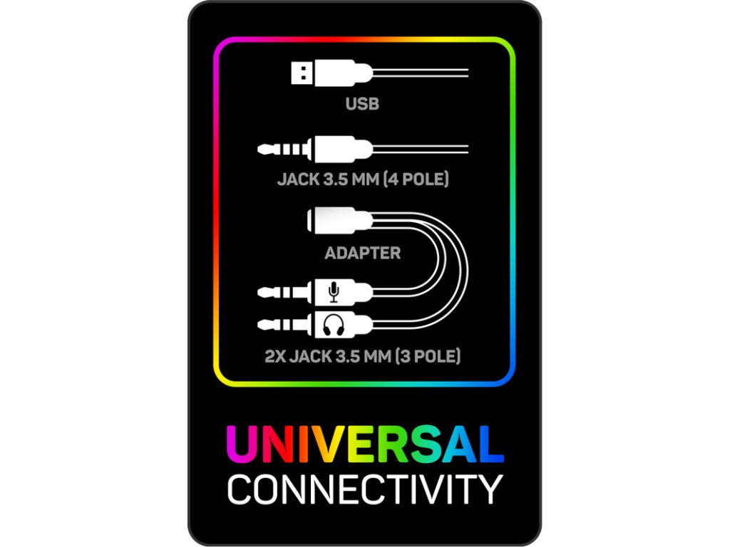 Moderní herní vzhled podtrhuje RGB Rainbow podsvícení v obou mušlích. Kombinace připojení přes 3,5mm Jack a USB zajišťuje širokou kompatibilitu s počítači, notebooky i herními konzolemi. USB konektor slouží k napájení podsvícení, zatímco zvuk je přenášen přes Jack, což přináší flexibilní použití napříč zařízeními.