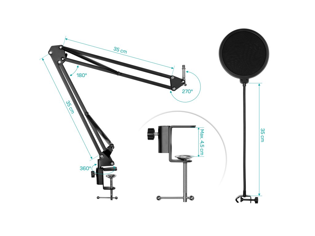 Mikrofon je uchycen na teleskopickém kovovém rameni s paralelogramovým mechanismem a dvojicí pružin, které umožňují plynulé nastavení výšky i úhlu. Rameno lze pevně zafixovat pomocí motýlkových šroubů a je určeno pro montáž na desku stolu o tloušťce až 4,5 cm. Bezrezonanční uchycení minimalizuje přenos vibrací ze stolu.