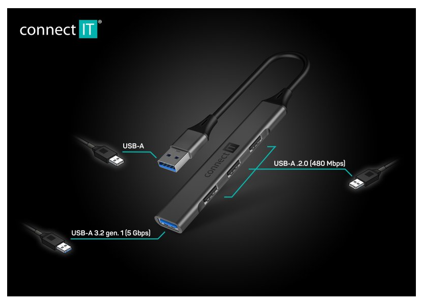 Connect IT Quattro Premium ANTHRACITE (CHU-4050-AN) je prakticky tvarovaný a kompaktní USB hub, který elegantně rozšíří jeden USB-A port o další čtyři. Nabízí kombinaci 1× USB 3.2 Gen 1 s přenosovou rychlostí až 5 Gb/s a 3× USB 2.0 portů pro běžné periferie. Ideální řešení pro situace, kdy váš notebook nebo stolní počítač nemá dostatek vlastních USB konektorů.