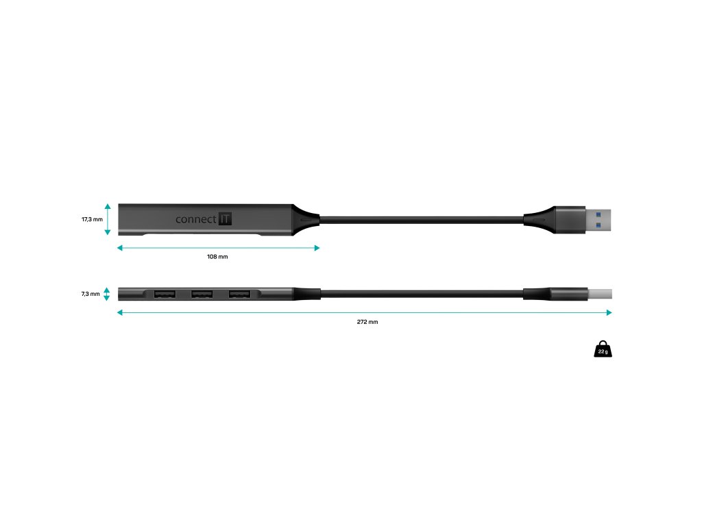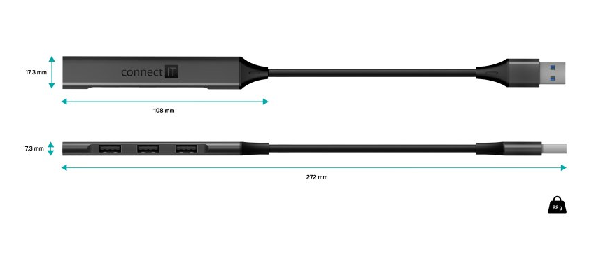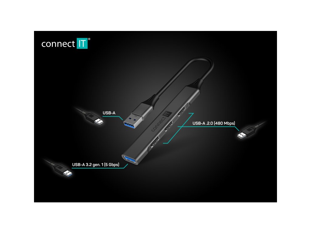Connect IT Quattro Premium ANTHRACITE (CHU-4050-AN) je prakticky tvarovaný a kompaktní USB hub, který elegantně rozšíří jeden USB-A port o další čtyři. Nabízí kombinaci 1× USB 3.2 Gen 1 s přenosovou rychlostí až 5 Gb/s a 3× USB 2.0 portů pro běžné periferie. Ideální řešení pro situace, kdy váš notebook nebo stolní počítač nemá dostatek vlastních USB konektorů.
