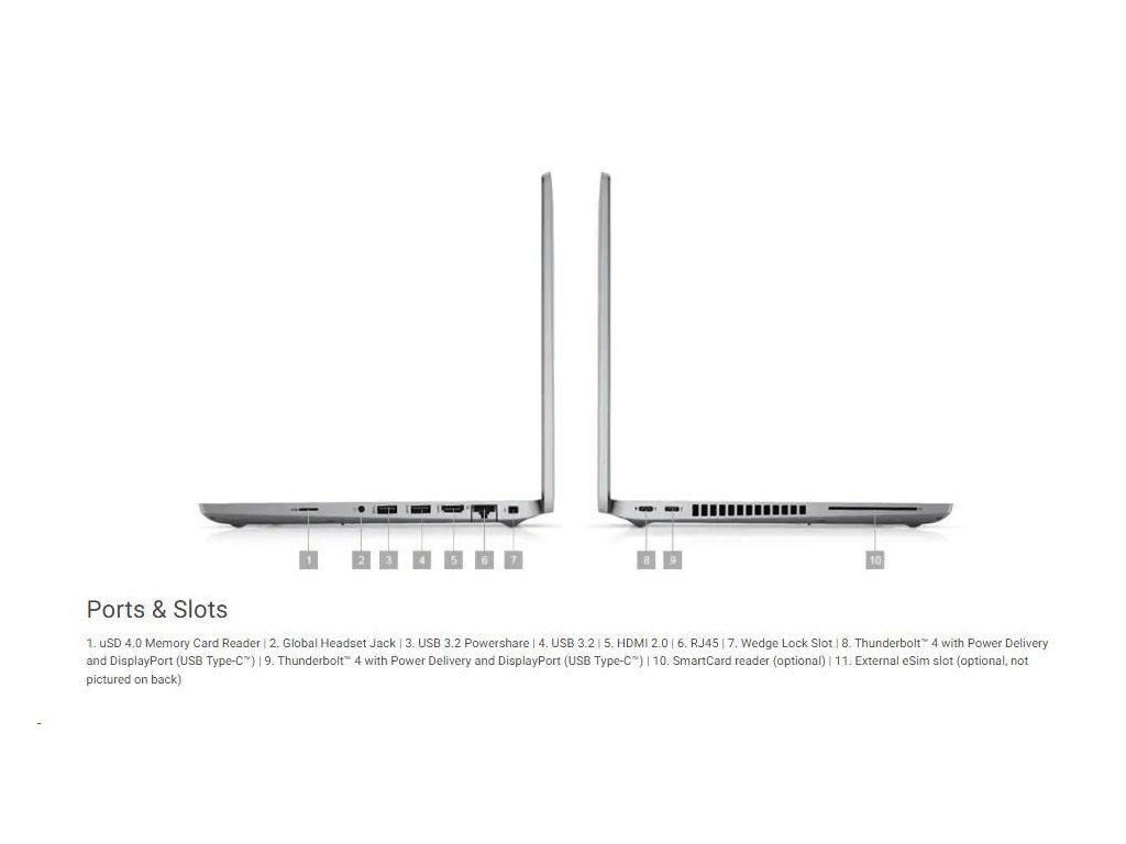 1. Čtečka paměťových karet uSD 4.0 | 2. Globální konektor na náhlavní soupravu | 3. USB 3.2 Powershare | 4. USB 3.2 | 5. HDMI 2.0 | 6. Port RJ45 | 7. Slot pro bezpečnostní zámek Wedge | 8. Port Thunderbolt™ 4 s napájením a portem DisplayPort (USB Type-C™) | 9. Port Thunderbolt™ 4 s napájením a portem DisplayPort (USB Type-C™) | 10. Čtečka čipových karet (volitelné příslušenství) | 11. Externí slot na kartu eSim (volitelný, nezobrazuje se vzadu)