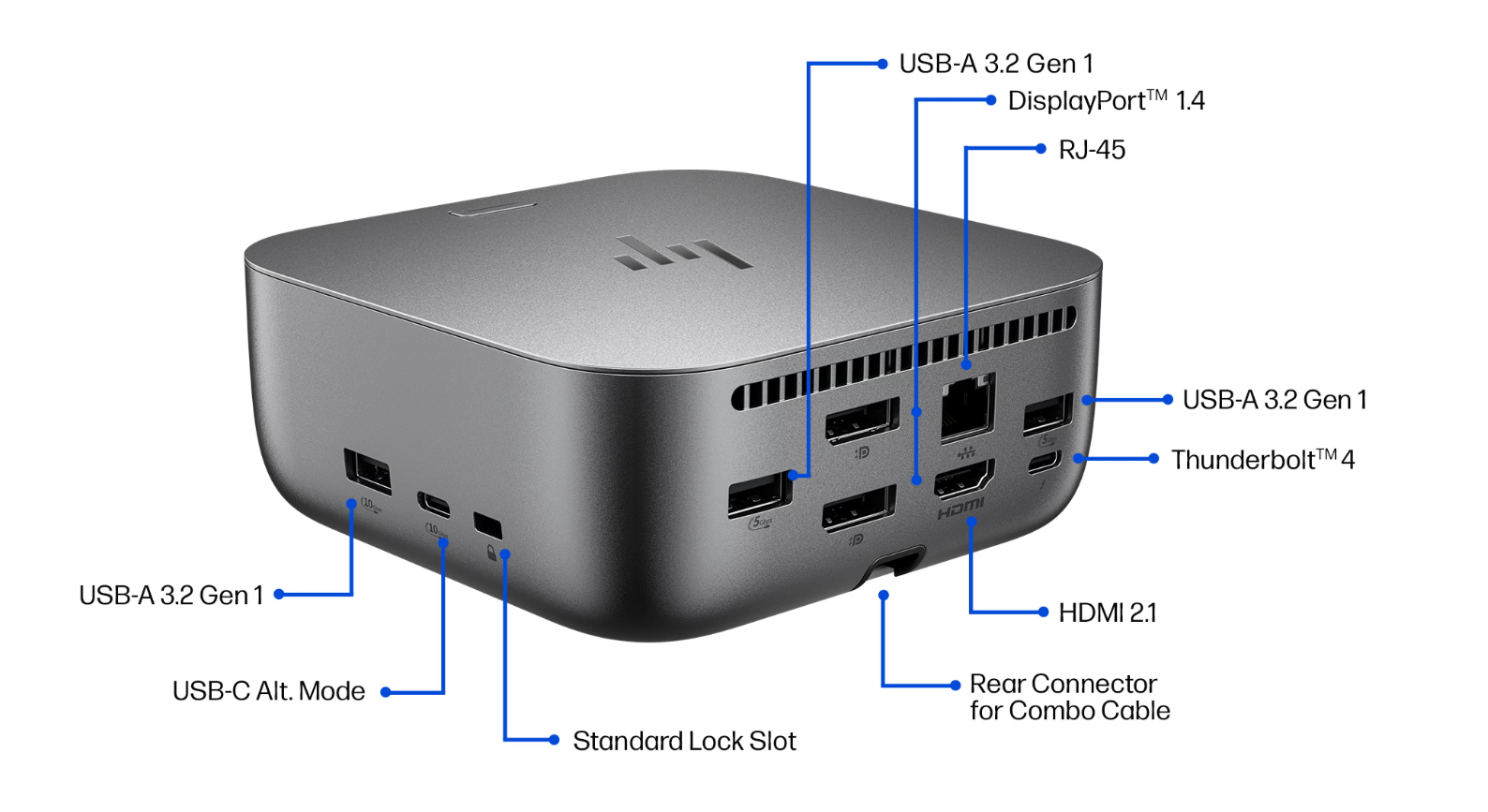 Využití nejnovější technologie Thunderbolt™ 4 zajišťuje extrémně rychlé datové přenosy, vysokou stabilitu připojení a širokou kompatibilitu nejen s notebooky HP, ale i s dalšími zařízeními podporujícími USB-C / Thunderbolt.