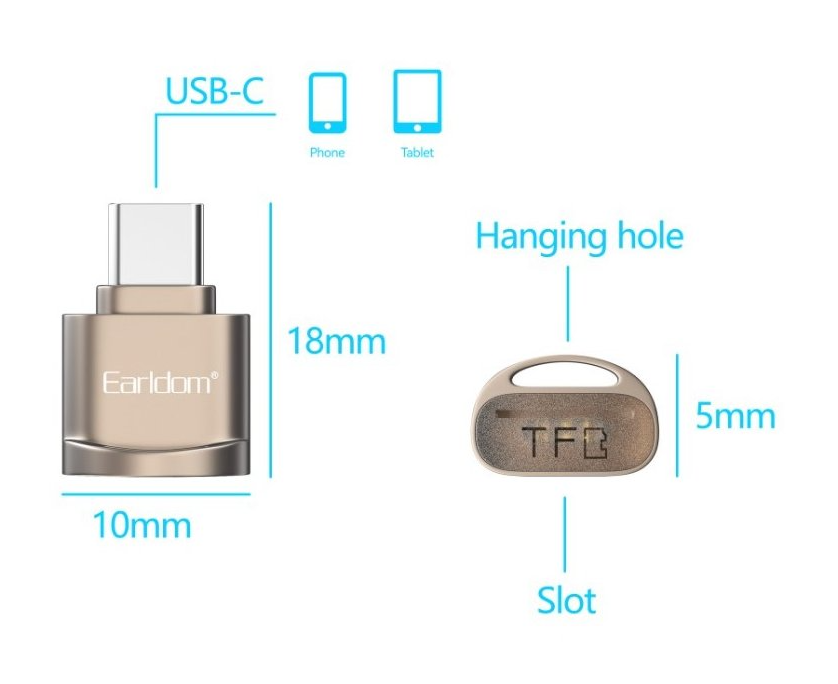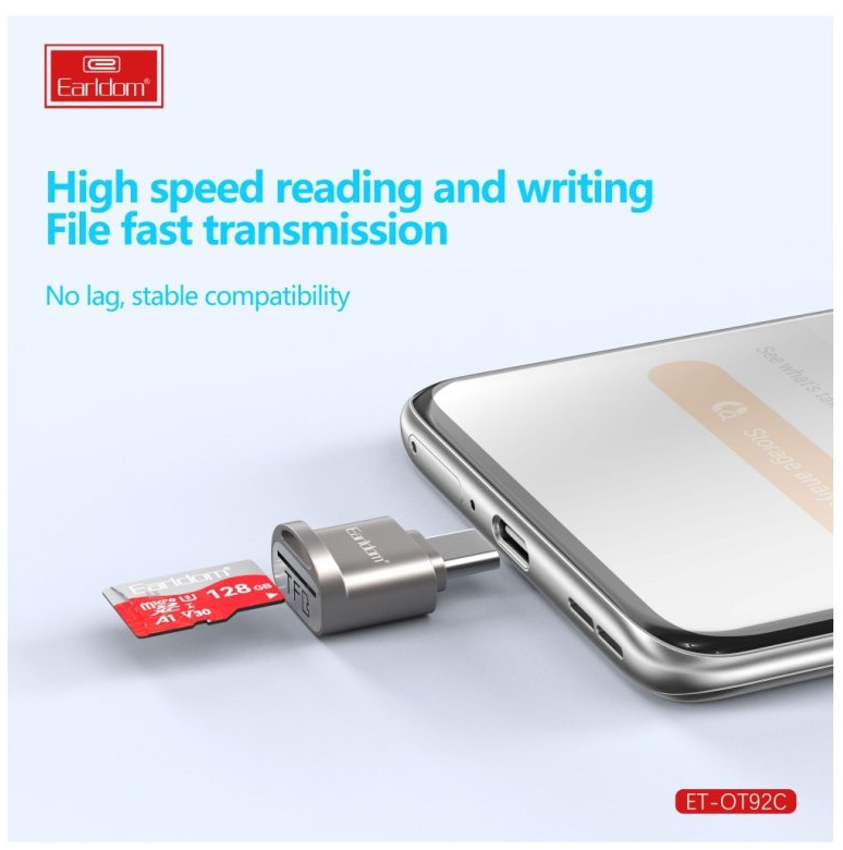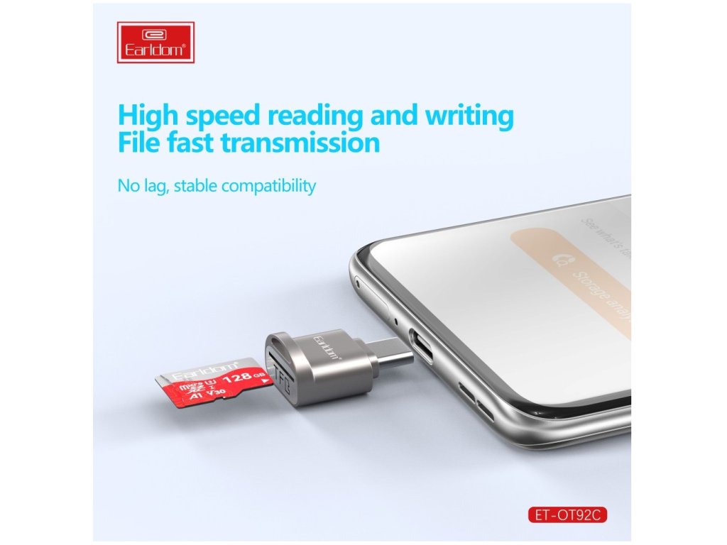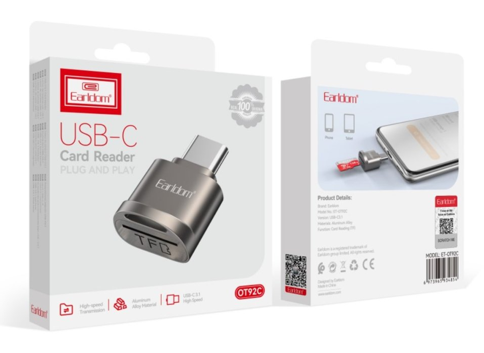 Kompaktní čtečka paměťových karet pro zařízení s USB-C. Čtečka Earldom ET-OT92C umožňuje snadný přenos dat z paměťových karet TF (microSD) do mobilních zařízení, tabletů nebo notebooků vybavených portem USB-C. Díky malým rozměrům ji můžete mít vždy po ruce.