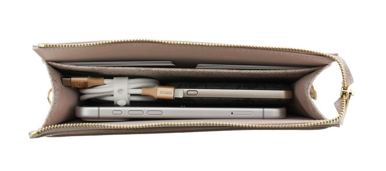 Taška je vyrobena z odolné PU kůže, která je příjemná na dotek a zároveň dobře chrání uložený obsah. Vnitřní část je vyztužena jemnou stélkou, díky které je telefon chráněn před povrchovým poškozením, poškrábáním i drobnými nárazy. Elegantní vzhled podtrhuje ikonické kovové 4G logo Guess na přední straně.