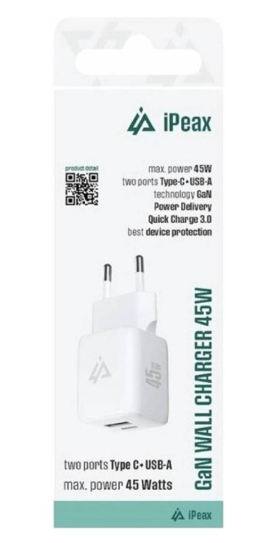 iPEAX GaN Síťová nabíječka 45 W, 1x USB-C a 1x USB-A bílá