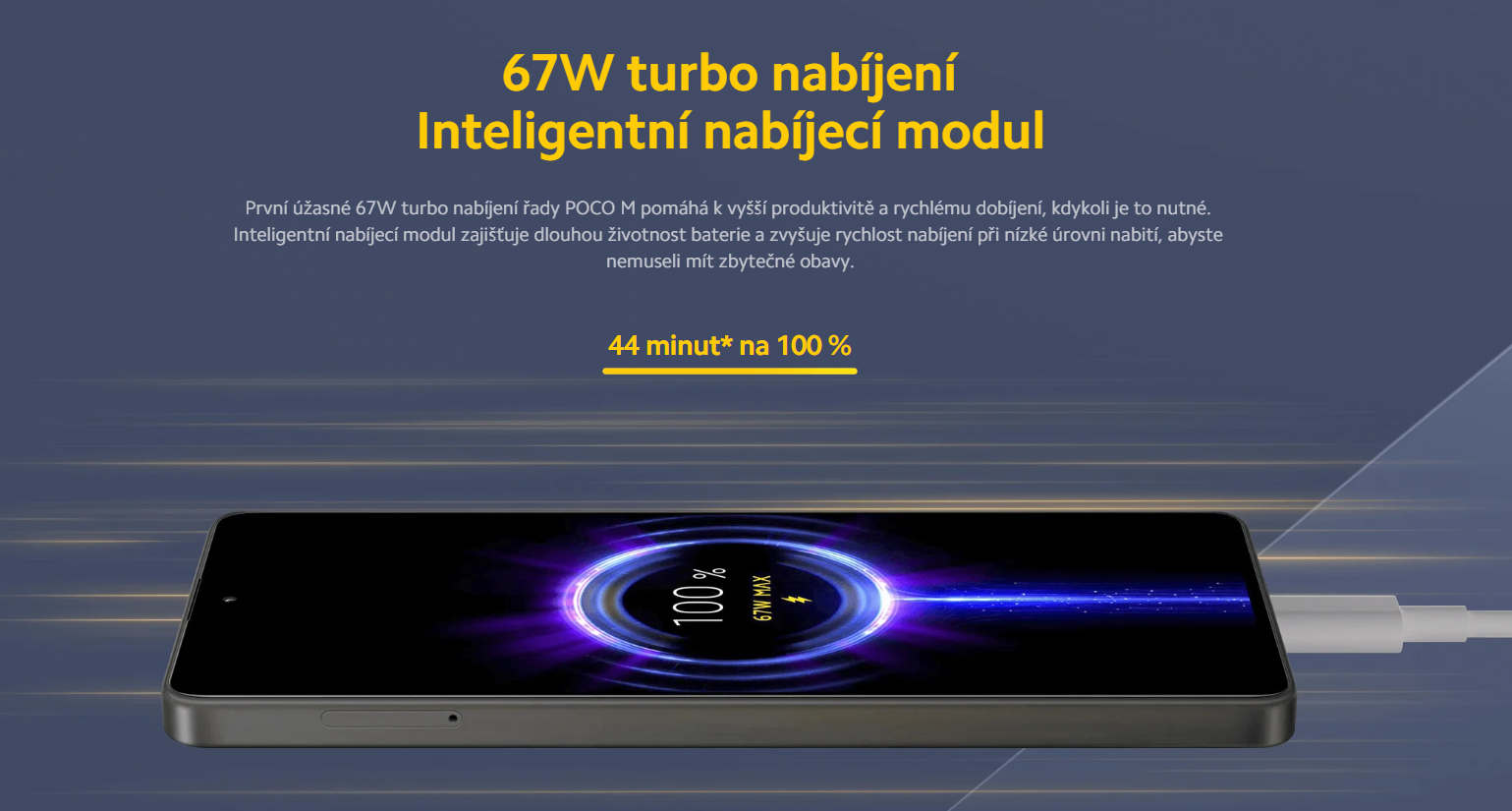 Poco M6 Pro podporuje výrazně rychlé kabelové nabíjení, které je navrženo pro uživatele s dynamickým životním stylem. Inteligentní řízení nabíjení zajišťuje efektivní doplnění energie v průběhu dne a přispívá k pohodlnému používání bez zbytečných prostojů.