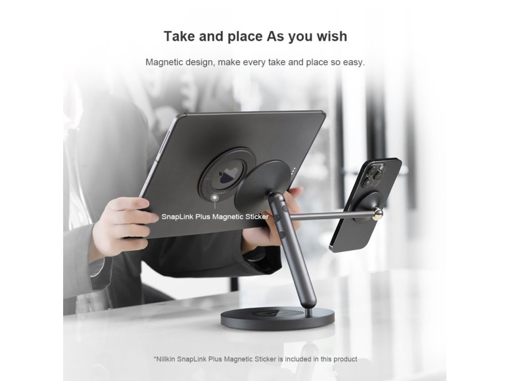 Umožňuje vzájemnou spolupráci více zařízení a snadné přepínání mezi obrazovkami, zrcadlení či projekce. Díky magnetickému designu je každé vzetí a umístění tak snadné. Základna s 360° rotací vám umožní ukázat obrazovku ostatním pouhým otočením. Díky protiskluzové podložce je velmi stabilní.