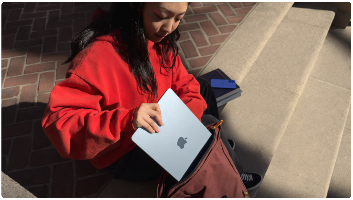 MacBook Air je navržen jako ideální společník na cesty – extrémně tenké tělo a nízká hmotnost umožňují snadné přenášení bez zbytečné zátěže. Díky tomu se perfektně hodí pro práci v pohybu, studium i každodenní používání mimo kancelář, kde je klíčová flexibilita a rychlá připravenost k práci.