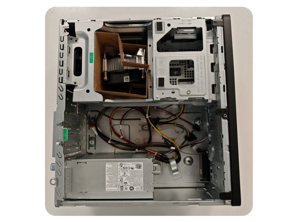 Vnitřní prostor nabízí montážní pozice pro komponenty v OEM provedení, které odpovídají originálním rozměrům a uchycení používaným u modelu HP Elite 880 G9 Tower. Součástí je také chladič pro CPU, který není osazen – procesor není součástí balení. Přední strana skříně je vybavena předním panelem s porty.