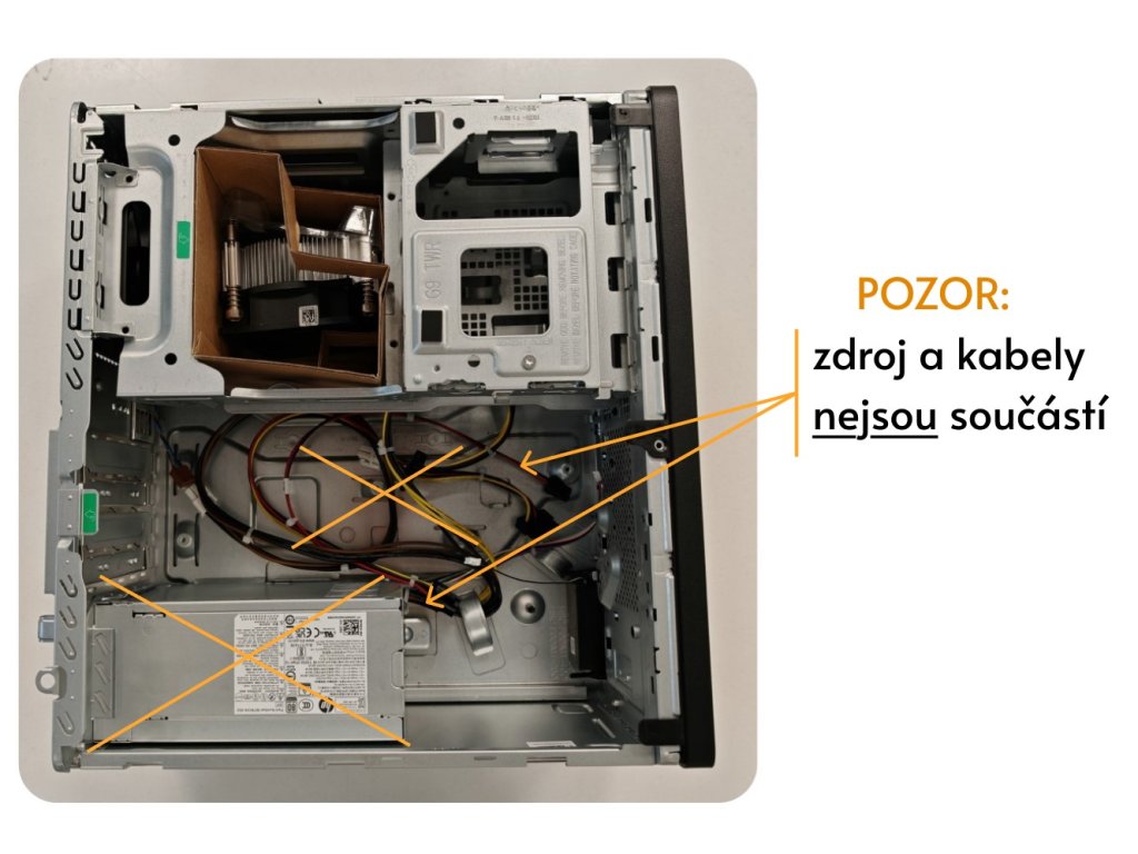 - Neobsahuje základní interní komponenty: základní desku, procesor, paměť RAM, úložiště, grafickou kartu, napájecí zdroj....