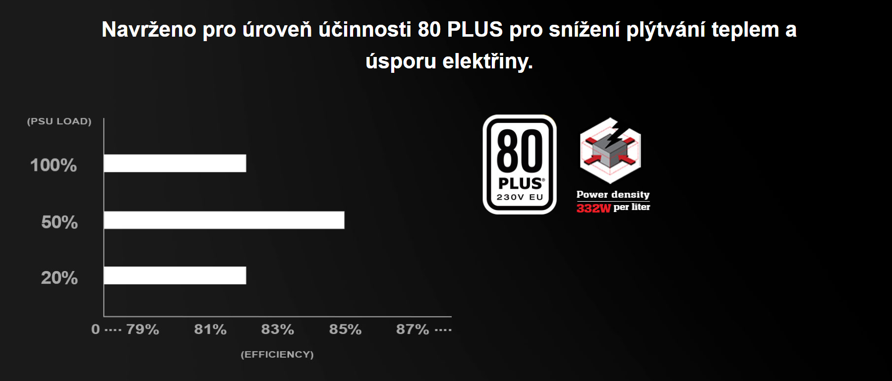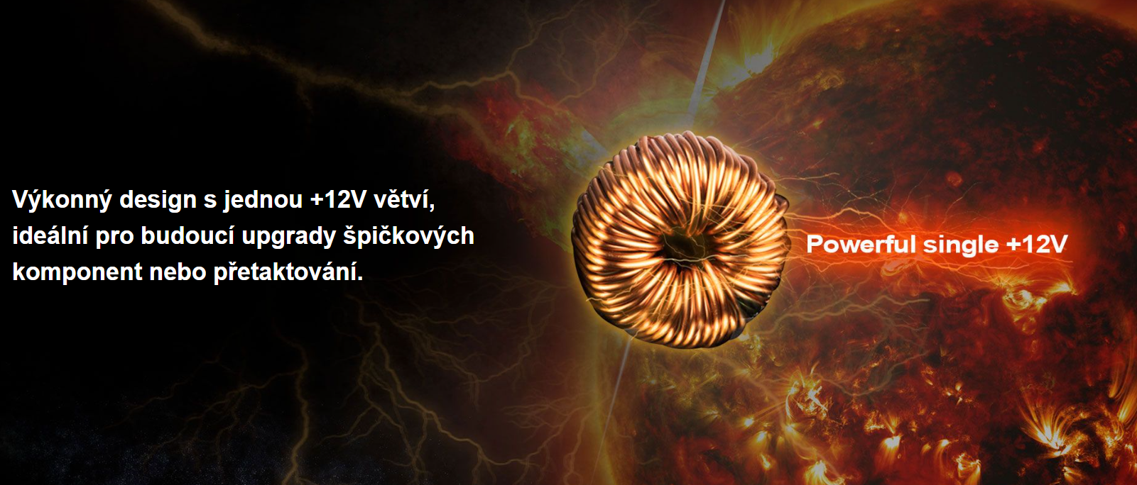 - Silná +12V větev: až 552 W pro stabilní napájení CPU a GPU
