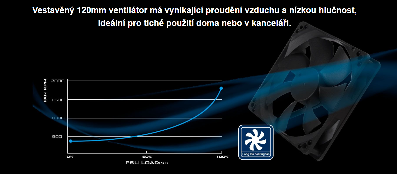 Vestavěný 120mm ventilátor nabízí velmi dobrý průtok vzduchu při nízké hlučnosti, což zaručuje tichý chod i při delším zatížení. Kompaktní hloubka 140 mm usnadňuje instalaci do většiny ATX skříní a přispívá k lepšímu uspořádání kabeláže i proudění vzduchu uvnitř sestavy.