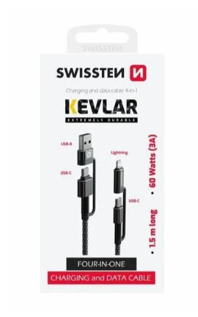 Kabel SWISSTEN KEVLAR 4in1 je navržen tak, aby vydržel i v náročných podmínkách. Díky vyztužení kevlarovým vláknem je velmi odolný vůči opotřebení a zlomení. S výkonem až 60W (3A) poskytuje stabilní a rychlé nabíjení pro všechna kompatibilní zařízení.