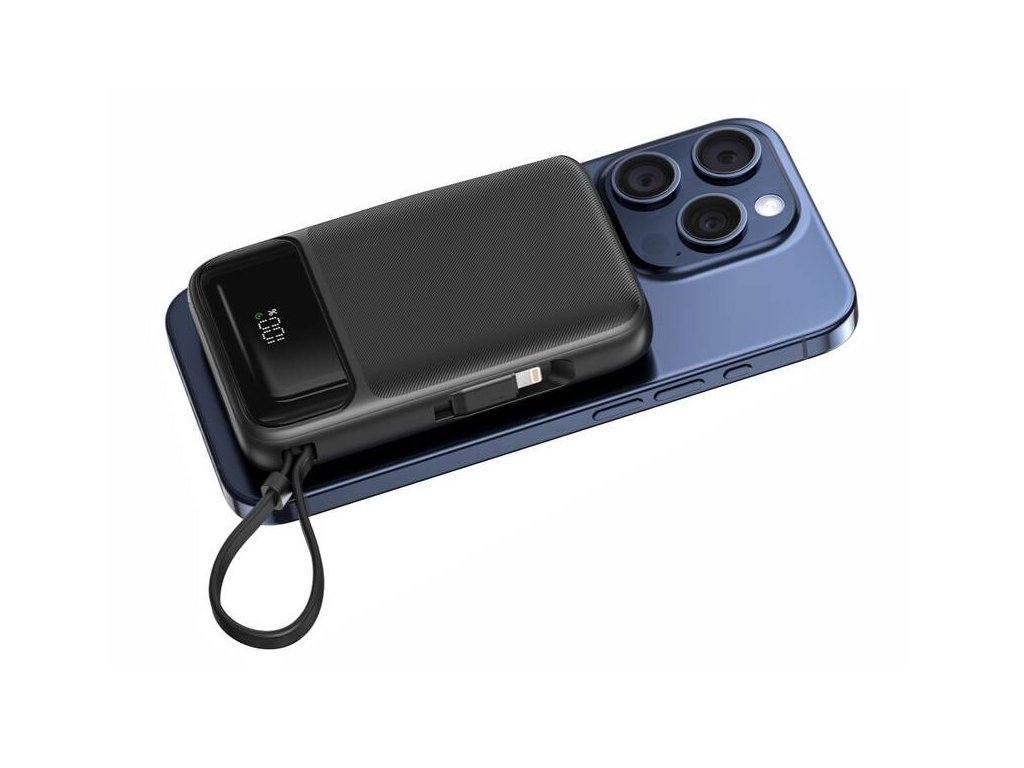 - Integrované kabely: USB-C a Lightning kabely přímo integrované do powerbanky pro pohodlné nabíjení bez nutnosti připojovat externí kabely.