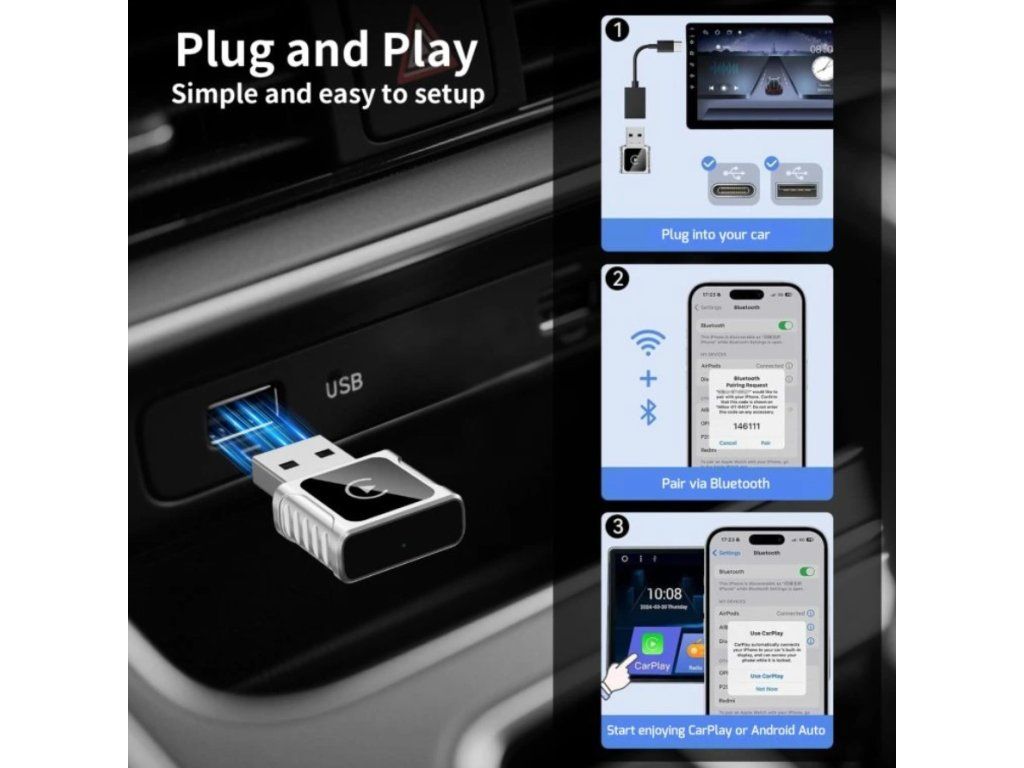 Instalace je zcela Plug & Play. Adaptér stačí zapojit do USB portu vozidla, spárovat telefon a během několika sekund můžete využívat všechny funkce CarPlay nebo Android Auto bez kabelu. Velkou výhodou je také možnost aktualizace firmwaru přes webové rozhraní, díky které zůstává zařízení dlouhodobě kompatibilní s novými verzemi operačních systémů i infotainmentů.