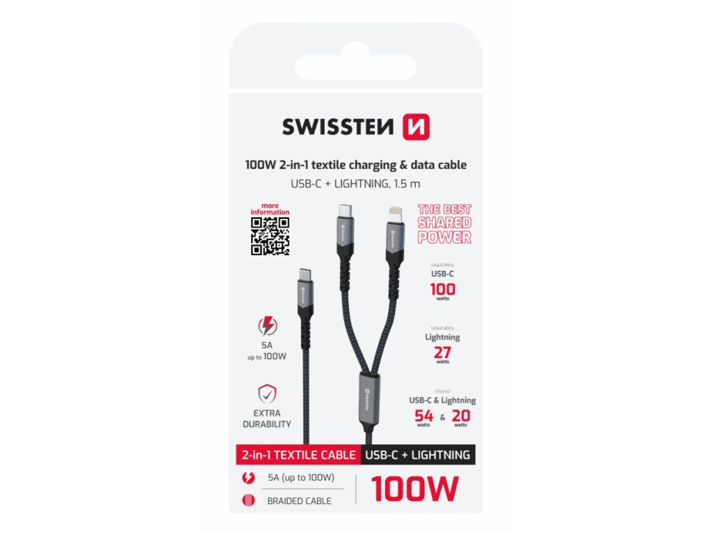 Swissten datový kabel 2v1, USB-C na USB-C + Lightning, 100W, 1.5 m - černá