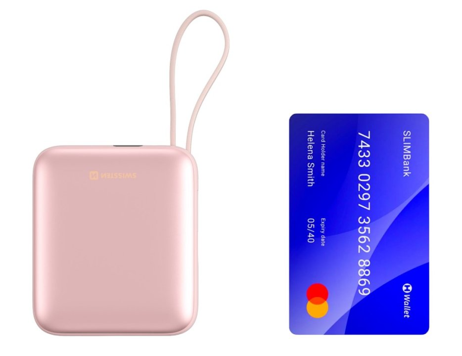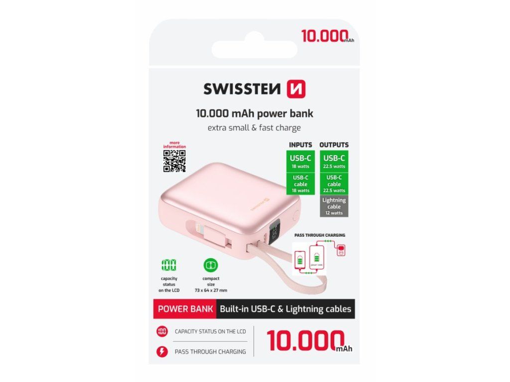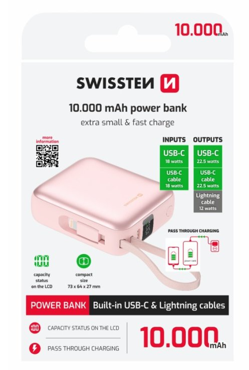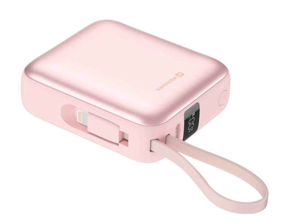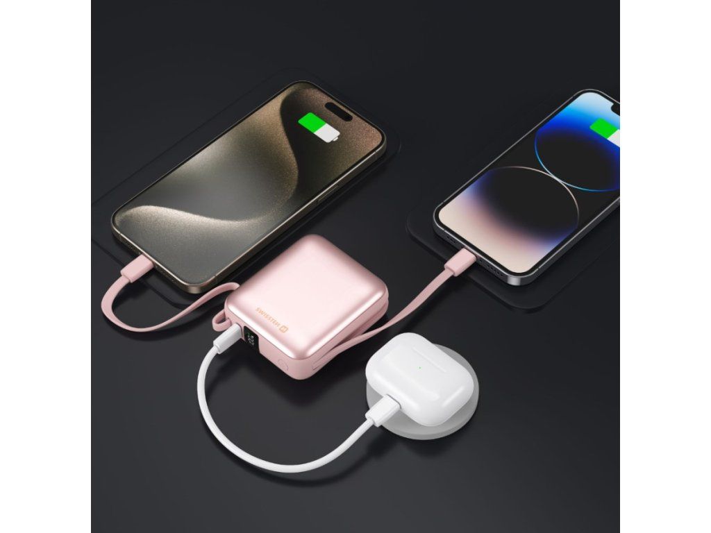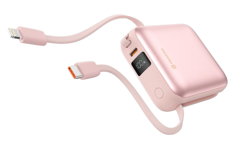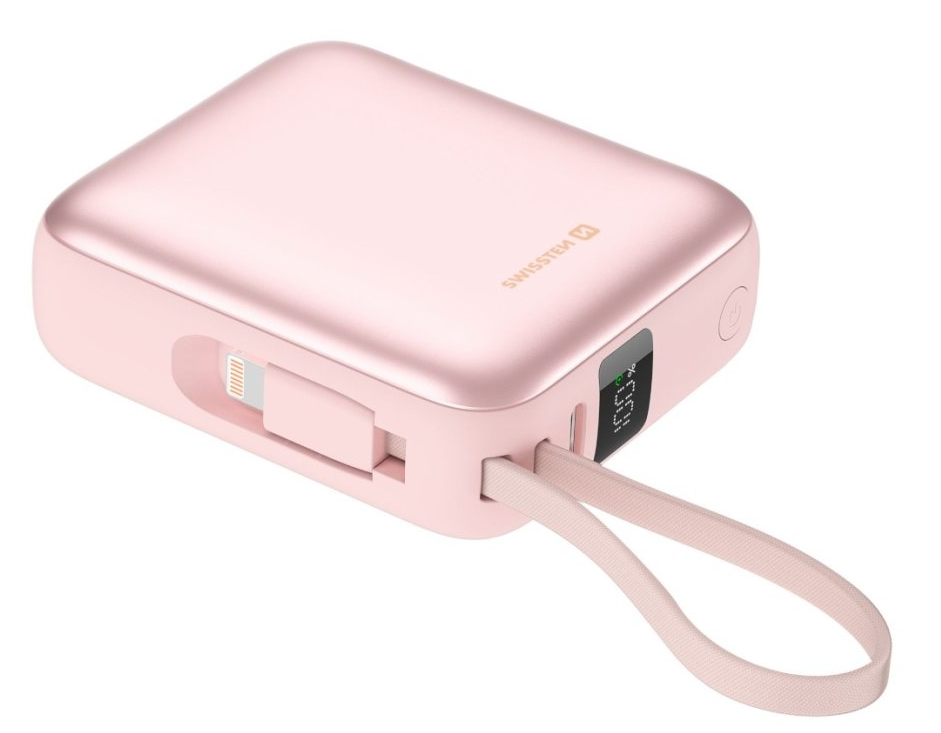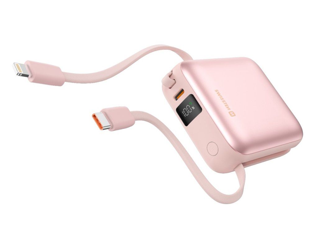 Swissten Power Bank Space 10000 mAh USB-C + Lightning (integrované kabely) – růžová