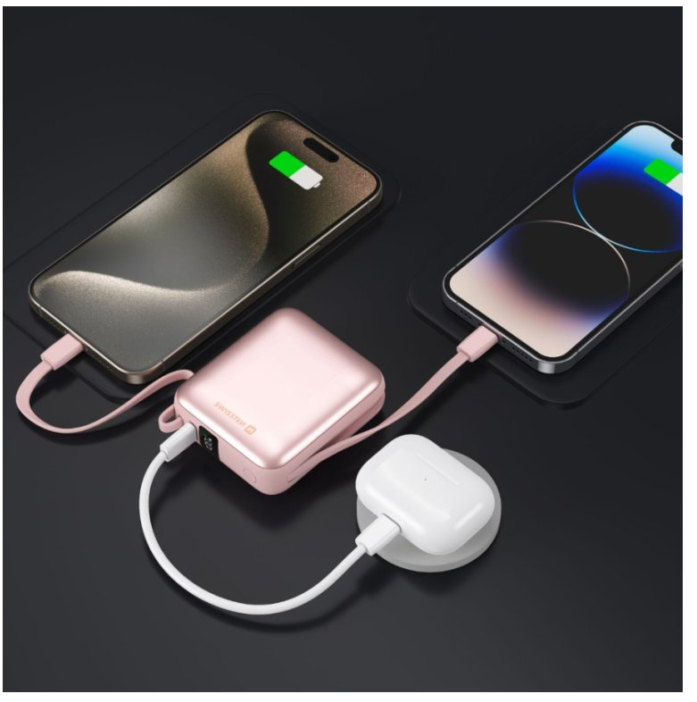 Kompaktní powerbanka Swissten s integrovanými kabely je chytré a praktické řešení pro rychlé nabíjení bez zbytečných kabelů navíc.