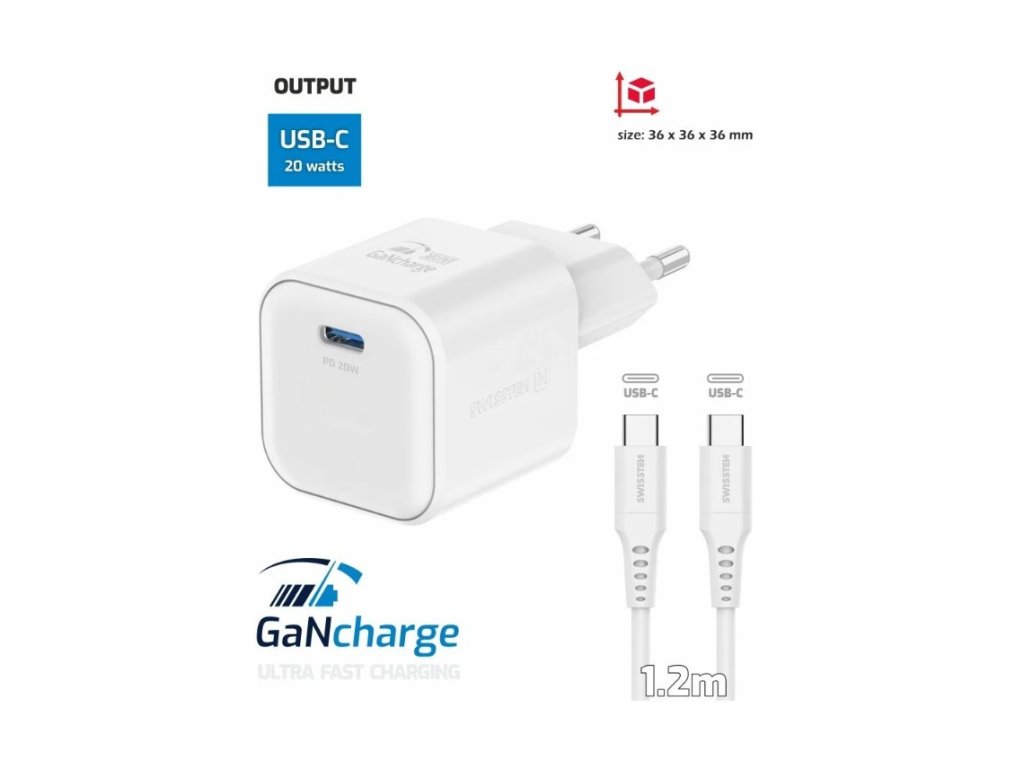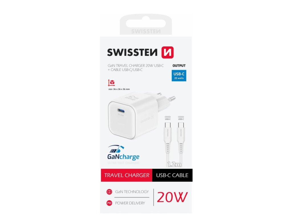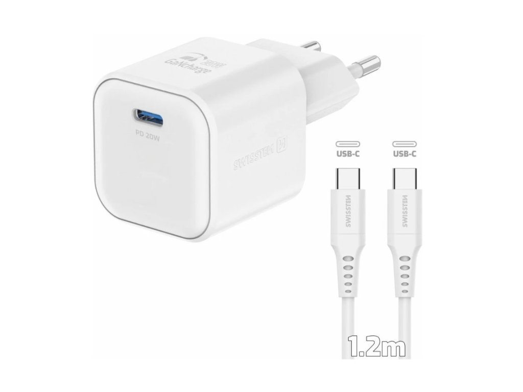 SWISSTEN síťový adaptér GaN, USB-C, PD, 20W, bílá + kabel USB-C, 1.2m, bílá