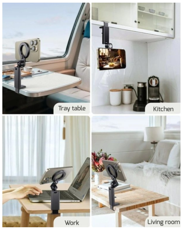 Díky čelisťovému uchycení na plochy do 35 mm lze držák připevnit téměř kamkoli – na pracovní desku, polici, rám postele nebo i na opěrku v letadle. Využití je opravdu široké.
