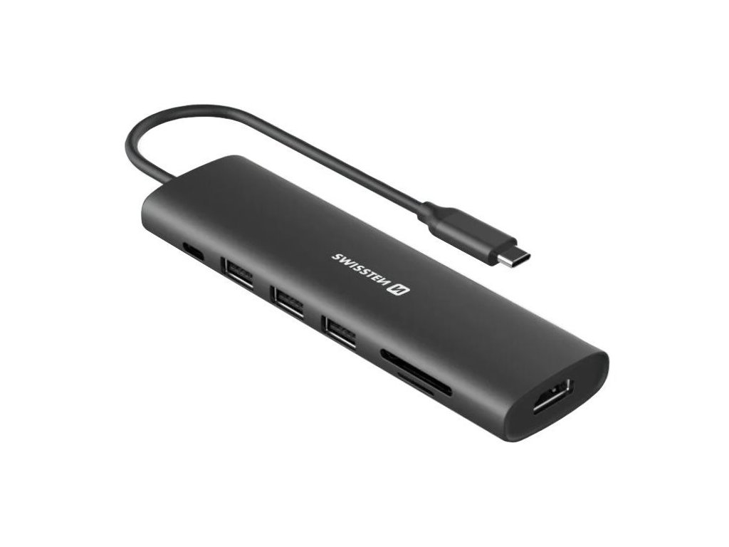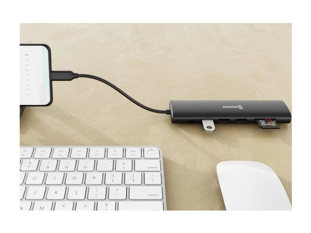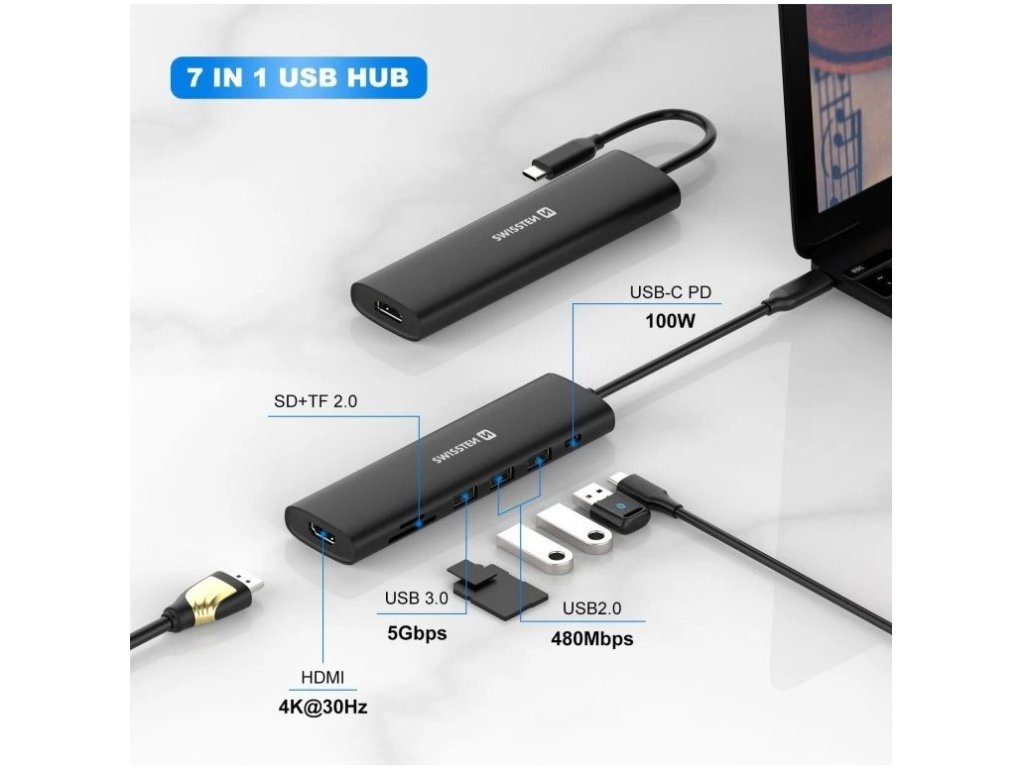 Swissten USB-C Hub 7-in-1 je kompaktní dokovací stanice, která vám umožní snadno rozšířit možnosti vašeho zařízení. Tento hub se připojuje pomocí USB-C portu a nabízí několik rozhraní, včetně HDMI pro připojení externího displeje, USB 3.0 pro rychlý přenos dat, USB 2.0 pro periferie, čtečky karet pro SD a microSD, a Power Delivery pro efektivní nabíjení.