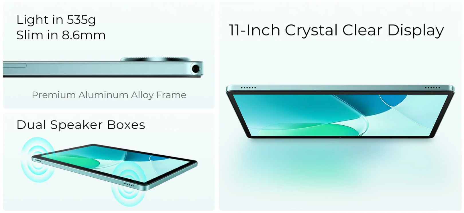 Tablet je vybaven 11" obrazovkou, která poskytuje dostatek prostoru pro práci i multimédia a přehledné zobrazení obsahu. Displej je vhodný pro sledování videí, čtení, prohlížení webu i práci s aplikacemi, přičemž jeho velikost podporuje komfort při delším používání bez nutnosti neustálého přibližování obsahu.