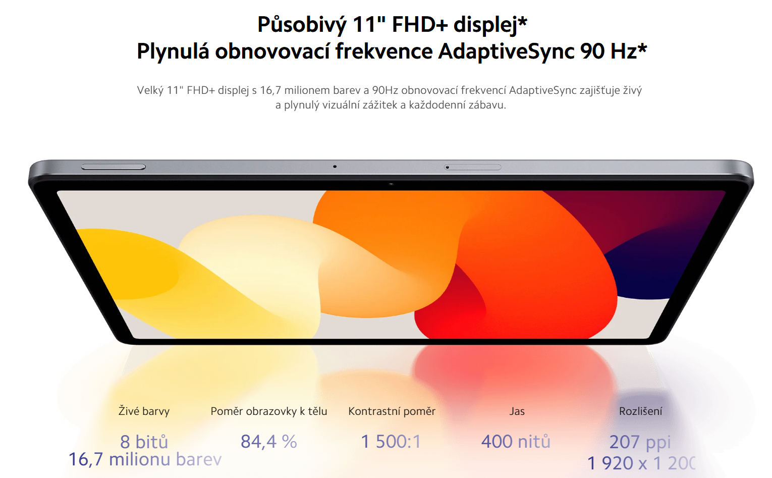 Dominantním prvkem tabletu je velký 11" displej s vysokým rozlišením, který poskytuje dostatek prostoru pro sledování videí, online výuku, čtení dokumentů i práci s více aplikacemi najednou. Zvýšená obnovovací frekvence přispívá k plynulejšímu posouvání obsahu, jemnějším animacím a celkově příjemnějšímu ovládání systému.
