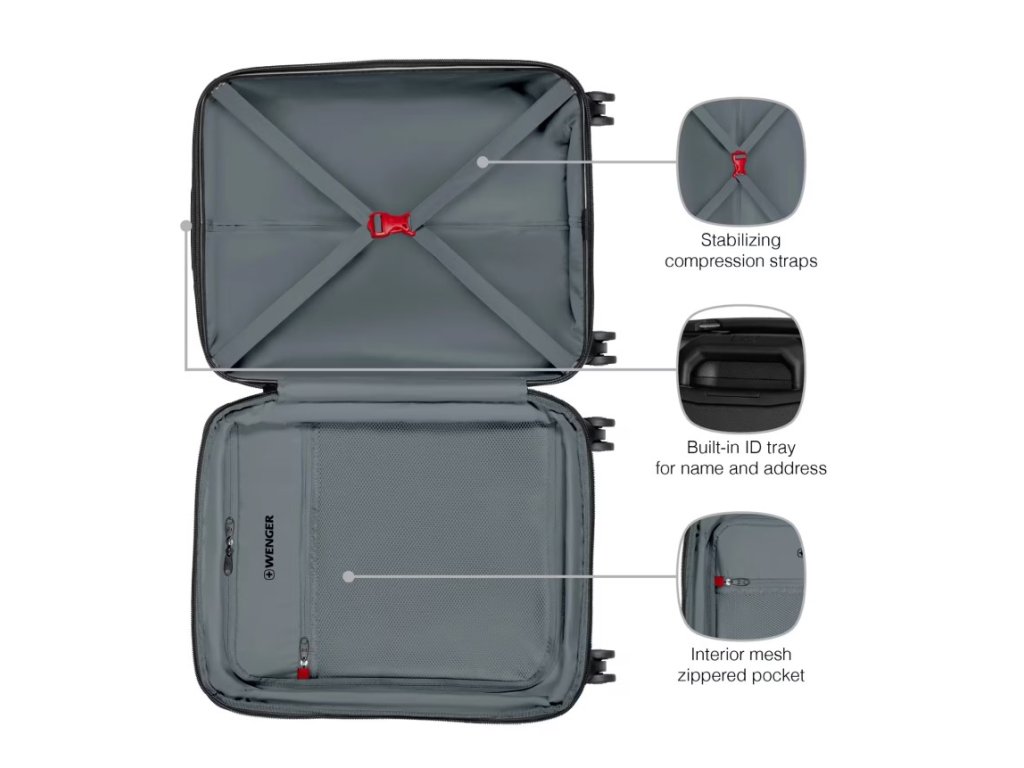 Kufr je vybaven Travel Sentry® Approved zámkem a dvojitým bezpečnostním zipem, které chrání vaše věci během přepravy. Uvnitř najdete kompresní popruhy pro stabilizaci obsahu a praktickou síťovanou kapsu na zip. Vestavěný ID tray pomůže s identifikací zavazadla v případě ztráty.
