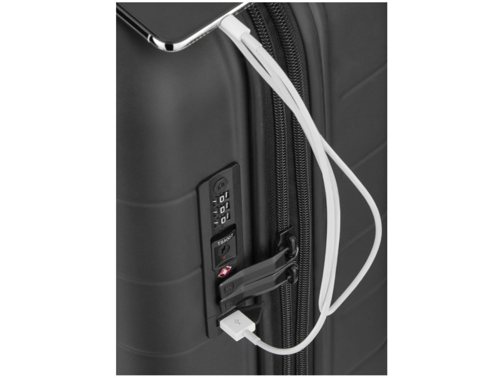 Praktickým doplňkem je USB port s nabíjecím kabelem, který umožňuje dobíjení elektronických zařízení během cestování a zvyšuje komfort při dlouhých přesunech.